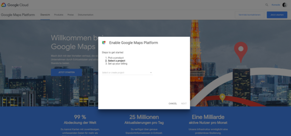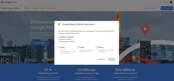 Google Maps Platform aktivieren und Produkt auswählen