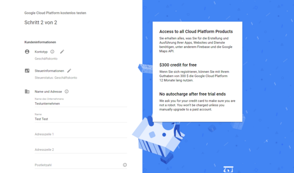 Im nächsten Schritt wirst du dazu aufgefordert, ein Zahlungsprofil zu erstellen und deine Abrechnungsdaten zu hinterlegen. Falls du die Google Maps Platform für die Website eines Unternehmens nutzt, wähle beim Kontotyp "Geschäftskonto" aus.