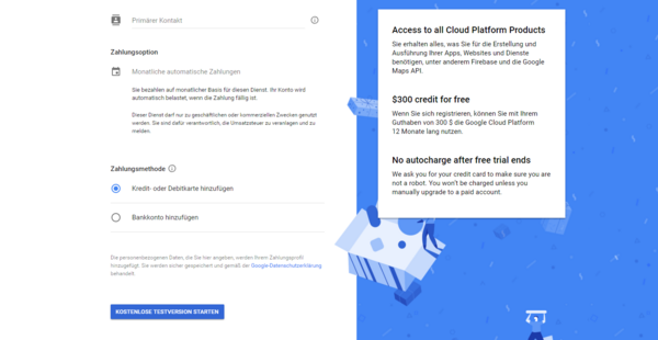 Mit Juli hat Google die Maps API (Schnittstelle für die Google Maps Dienste) auf ein Verrechnungsmodell umgestellt. Das heißt, dass API Keys nur mehr generiert werden können, wenn man ein aktives Verrechnungskonto für die Google Maps Platform besitzt. In diesem Konto muss eine Zahlungsmethode hinterlegt sein (Kreditkarte, Kontodaten).