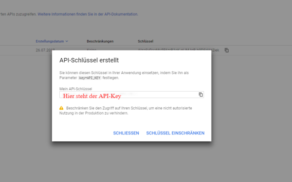 Zusätzlich empfiehlt es sich, den API Key einzuschränken, um unberechtigte Zugriffe zu verhindern. Durch die Einschränkung kann der API Key dann für die dafür vorgesehenen Dienste verwendet werden. Bsp: Einschränkung auf Domain, IP-Adresse, App...
