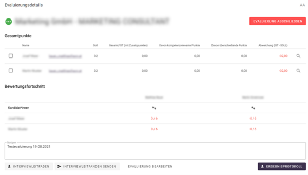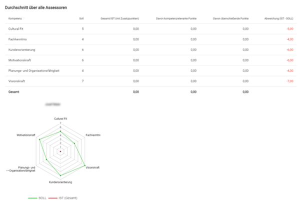Am Ende wird dann ein druckfertiger Bericht über alle Bewerter, die Kandidaten und deren Abschneiden hinsichtlich der jeweiligen Kompetenzen generiert.